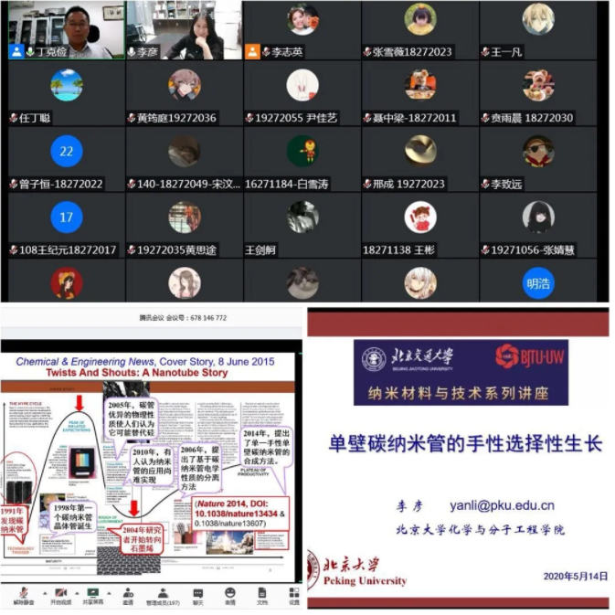 2020年5月14日晚,我院中外合作项目纳米材料与技术专业主办的“纳米材料与技术系列讲座”在腾讯会议平台举行。在此众志成城抗击疫情的特殊时期,我们有幸邀请到北京大学化学学院教授、英国皇家化学会会士李彦与咱们共聚云端,作了题为“单壁碳纳米管的手性选择性生长”的主题讲座。本次讲座由我院丁克俭教授主持。